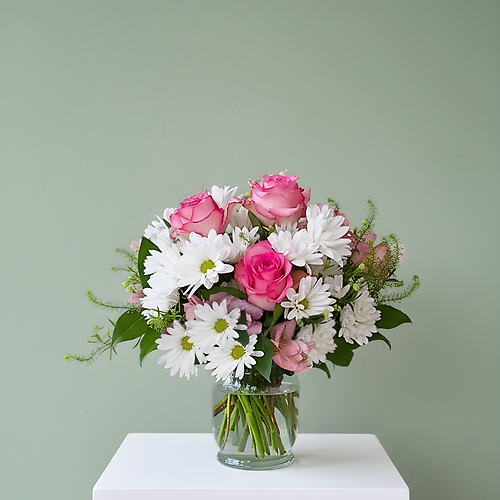 Capture the simple magic of a sun-drenched afternoon with this charming, textured bouquet. Playful white daisies and ruf