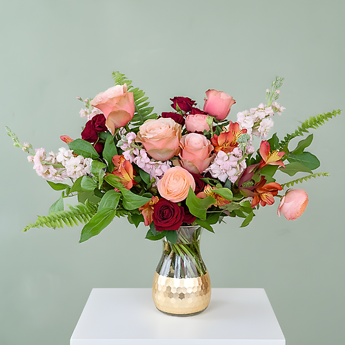 Warm her heart and her home with this glowy, sunset-inspired beauty! Bursting with juicy peach roses and pops of "velvet