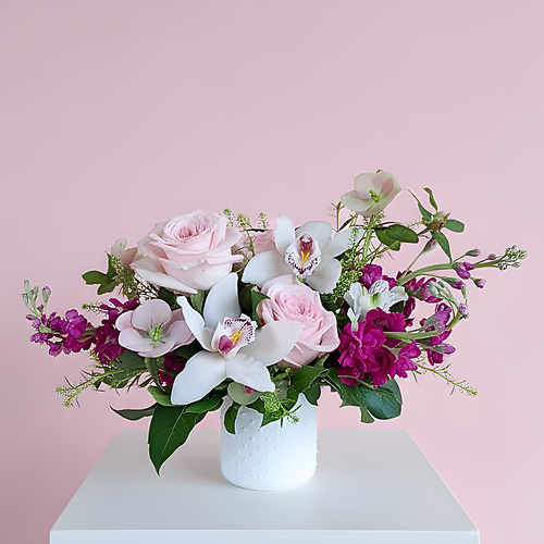 Celebrate her timeless elegance with a design as unique as she is. This sophisticated arrangement pairs exotic white cym
